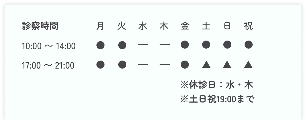 お仕事帰りでも無理なく通えるよう、夜21時まで診療しています。(土日祝19時まで)